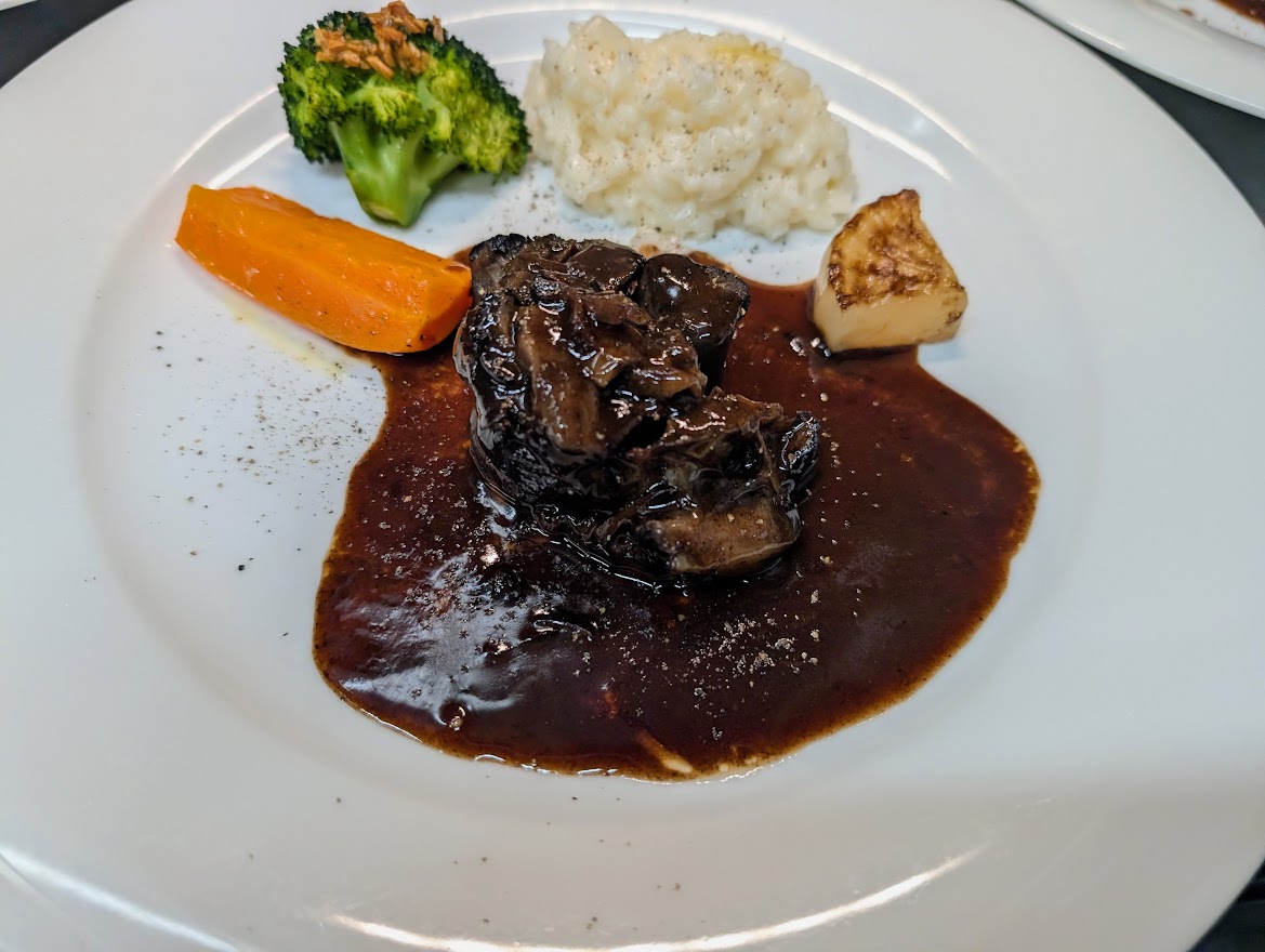 Jarret de boeuf du Japon au vin rouge 国産牛すね肉の赤ワイン煮込み 交雑牛といって、黒毛和牛と乳牛のミックスです。スネ肉はコラーゲンがたっぷり!肉5キロ煮るのにワインを8本!赤ワイン6本とマデラワインを2本、フランス人なら全部赤ワインで煮るところですが、それだと味がきついので、みりん感覚で甘口のマデラワインを入れます。もうトロトロに煮えてますよ!飲み物ですね。(笑)これには、、