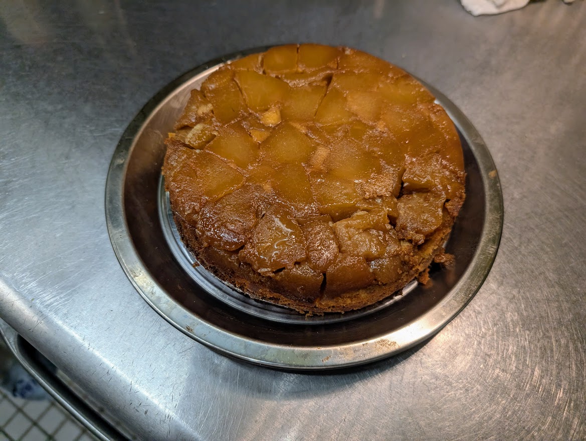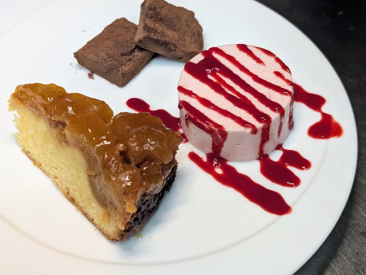 Mousse de fraises,coulis de framboises イチゴのムース、木苺のクーリ添え Pave de chocolat VALROHONA MANNJARISヴァローナ、マンジャリの生チョコパヴェ Gateau renversee d'Amandes etPommesアーモンド生地とリンゴのひっくり返しケーキ デザートですね。 ひっくり返しケーキとは、型の中に焼きリンゴを並べて、上からアーモンドの生地を流して焼き上げてひっくり返します。