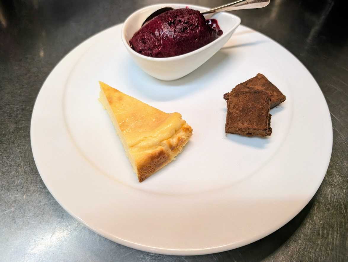 Gateau au Fromege Basque. バスク風チーズケーキ Sorbet de Cassis tres crse. 超濃厚カシスのソルベ Pave de chocolat a l'orange. オレンジ風味の生チョコパヴェ デザート3種ですね。 バスクチーズケーキは、クリームチーズと生クリームがたっぷりな配合で、リッチなケーキです。数年前から流行っていて、「半生焼けのチーズケーキ」という表現が多くみられたんですが、私的には半生は違うなと思っていて、少しですけど小麦粉も入るので、しっかり芯まで焼いてありますよ。生クリームが多いので、すごくしっとりしてますよ! カシスのソルベは、「何もそんなに濃くしなくてもよくね?」ってくらい濃いです。(笑) 生チョコはベルギーのカレボー社のチョコにスペイン産のオレンジピールとオレンジリキュールのコアントローを入れてあります。これにはもちろん、、、、
