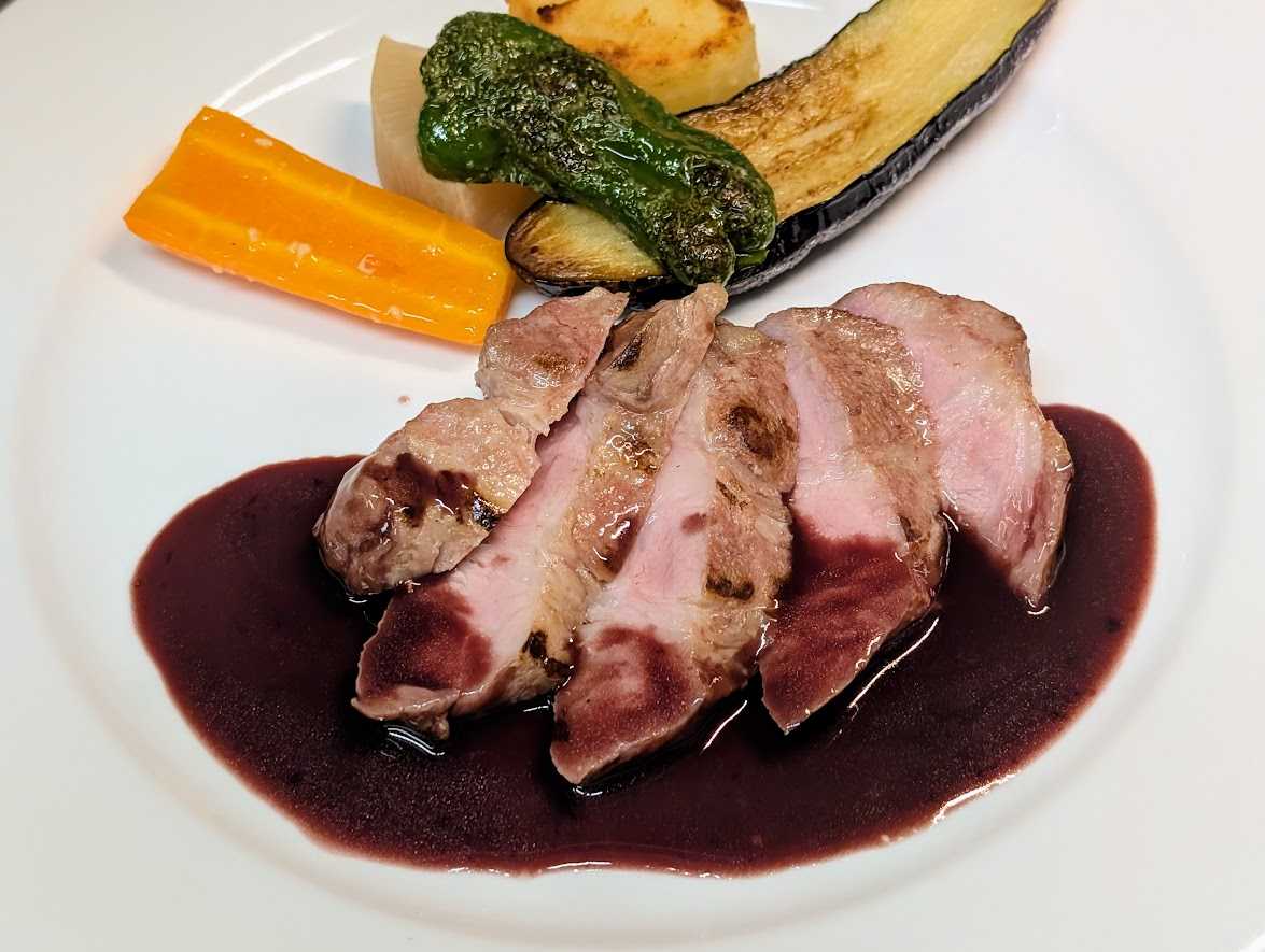 杜仲高麗豚の肩ロースのロースト、赤ワインソース、ほんのりニンニク風味