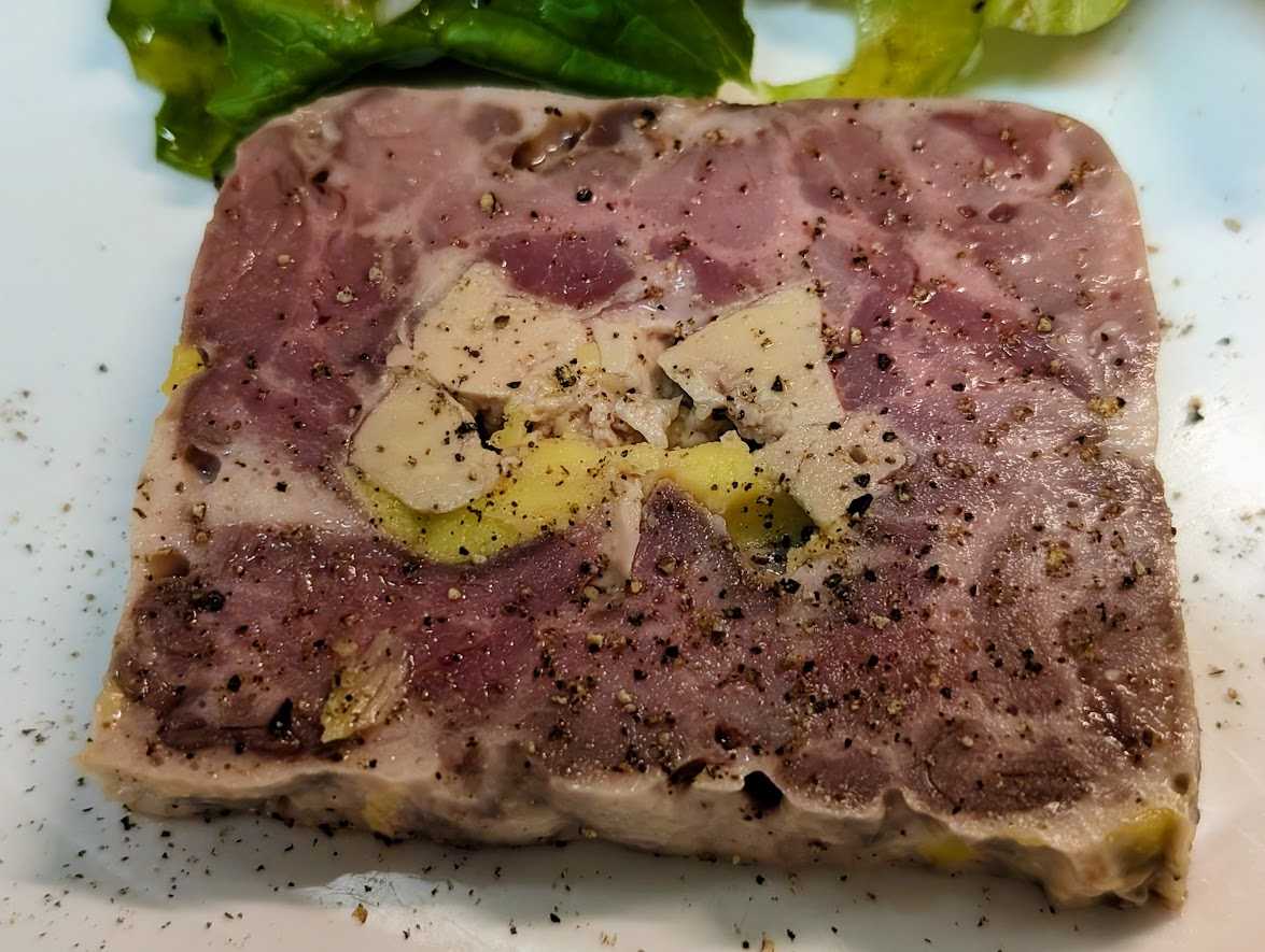 Terrine de Chvreuil d'été,Moussse de poulet KINSOU au Foie gras avaec Salade et Jambon d'Aubergne.