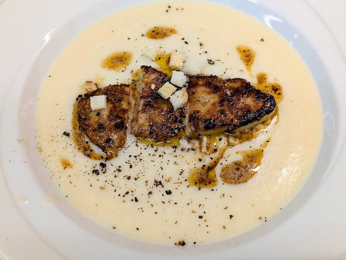 Potage doux d'Oignons Nouveau a ma jaedin et Foie gras chaud.