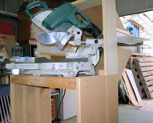 大鋸屑対策のカバーですが全角度を覆うようにするとかなり大袈裟な大きさになります。マイターソーは90度以外でカットする頻度は少ないことから回転させた時はフラップからはみ出る構造としました。後方の湾曲したカバーとフラップはフロアマットで作ってみました。--これでもオガクズが大きく飛散することは防げると思います。-----後は大鋸屑受けの引き出しを作るつもりです。