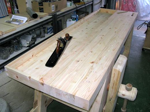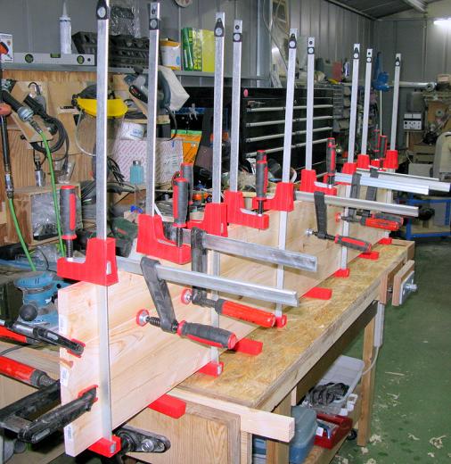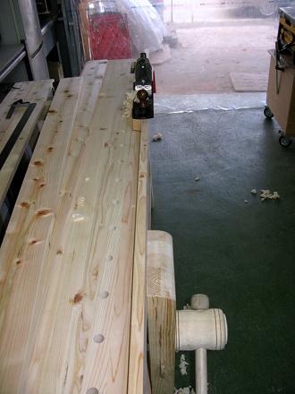 3枚の板材を接着しています。最初は長い薄板を溝入れしつなぐつもりでしたが板の曲がりでNG、急遽短いビスケット状の中継ぎを10個ほど作成し勘合させました。---クランプで締め上げ接着中。。一晩乾燥後、クランプを取外しました。ブロックプレーンやサンダーで仕上げます。