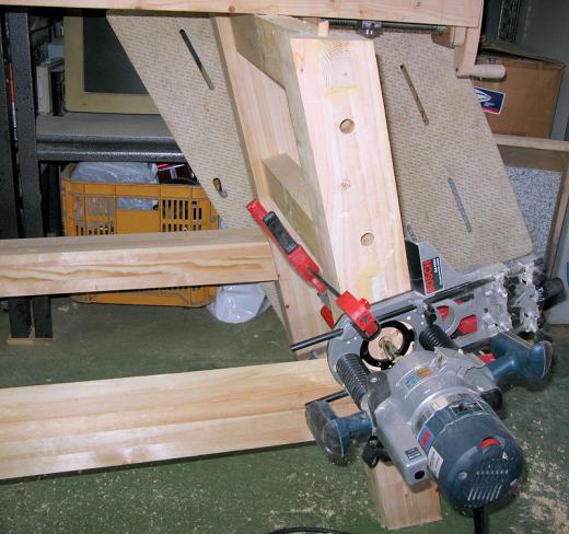 ワークベンチの右脚に穴あけをルーターなどを使って開けています。長い板の固定時に使うつもりです。ベンチを一旦、全て分解し仕上げ作業に入りました。鉛筆跡や細かな傷などをサンディングしています。塗料はWATCO(danish oil)をアマゾンにオーダーしました。周囲の林は葉が落ちて冬本番を迎えつつあります。