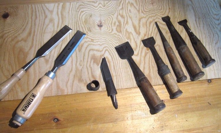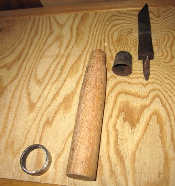 口金のテーパーに合わせて柄材を旋削しました。カツラ(下輪)が無かったのですが丁度良いサイズのパイプをカットし作成。。柄の先端に下穴を開けてNarexの細いノミで「込み」用の角穴を仕上げ、全体を組み上げました。仕上げに柄にオイルを塗布し完成です。実はこのノミは木工用ではありません。!先端を潰したラウンド刃に仕上げてあり、ベアリングを抜く時などに使います。https://plaza.rakuten.co.jp/citroen/diary/201511190000/