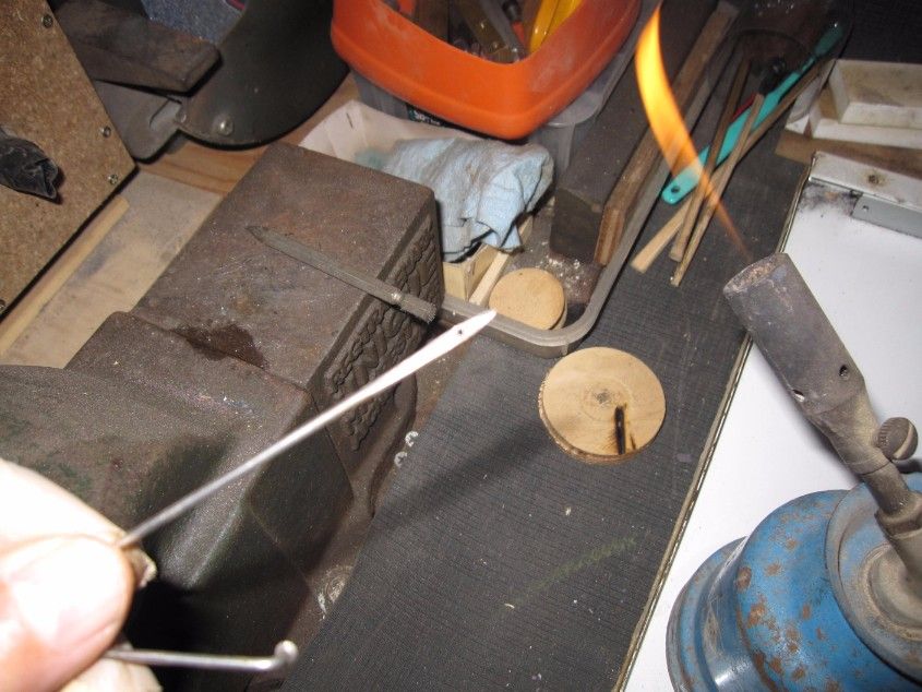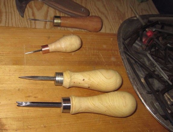 ラウンドナイフ(革包丁)は未だ十分に研げてないのですが・・なんとなく流れでSticherを試作してみようと思います。自転車工具箱の中にステンレススポークを取り出しガスで赤熱させハンマリングで整形します。楕円に叩いてから古いドライバービットの先端を尖らせた自作ポンチで穴を開けました。これをミニハンマーで少し横も少し叩いて針状に整形しました。手持ちの水糸用のナイロン糸を通して青棒を塗り、スライドさせ針穴を磨きました。先日の残りのデッキ材丸棒を木工旋盤用バイトで削りグリップハンドルを作ります。試しに家に在った調理用のタコ糸を通して、簡易版Speedy Sticherの出来上がりです。針がちょっと太めですが・・・粗く縫うくらいは出来そうですかね。。