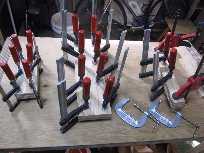 クランプ部にツマミを取付けます。T字ハンドルを内側に仕込みました。ツマミを接着中。。他に丸いツマミも2個作りました。全体にワトコオイルを塗り乾燥待ちです。完成までもう一息です。