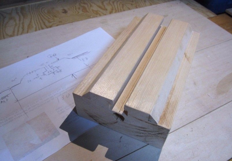 使っている旋盤は通称4尺物ですのでベッドが少し短い・・と感じる場合があります。時にテールストックを退避させて旋盤上で手作業したい場合などもう少し右側に寄せたいとなぁ・・と思ったりします。そこでベッドを延長して心押台の逃げ場を作ろうと思います。特に頑丈な必要は無いので端材の木で作ってみます。テーブルソーで70x70x250mm程度の角材を2本曳き出し溝入れし鉋掛けします。2本を接着します。テーブルソーで不用部分を削り落としたのですがトップ面の肩の部分には別に三角棒をブロックプレーンで削りだし追加して行きます。全体を逆さにしてバイスの上で重石を載せ三角棒を接着しています。・・続きます。