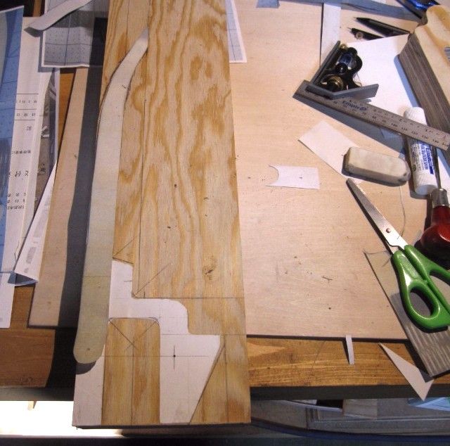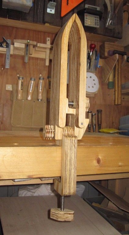 最初に素材をカットします。丁度大工さんの所から12mmの合板の端材が出たので利用します。2枚合わせと3枚合わせで接着しました。まず始めにワークベンチを挟めるようなクランプを作ります。お手本の画像を参考に、アレンジした型紙を作り素材に貼り、加工して行きます。R部分を穴開けしバンドソーで不要部をカットアウトします。この後、ベルトサンダーで整形しました。押しネジ部は貰い物の75mmアルミ製クランプを利用しようと思います。金鋸で切り落とし・・その雌ねじ部を旋盤で加工しました。木製クランプにネジ部を移植、エポキシで接着しました。続く・・・