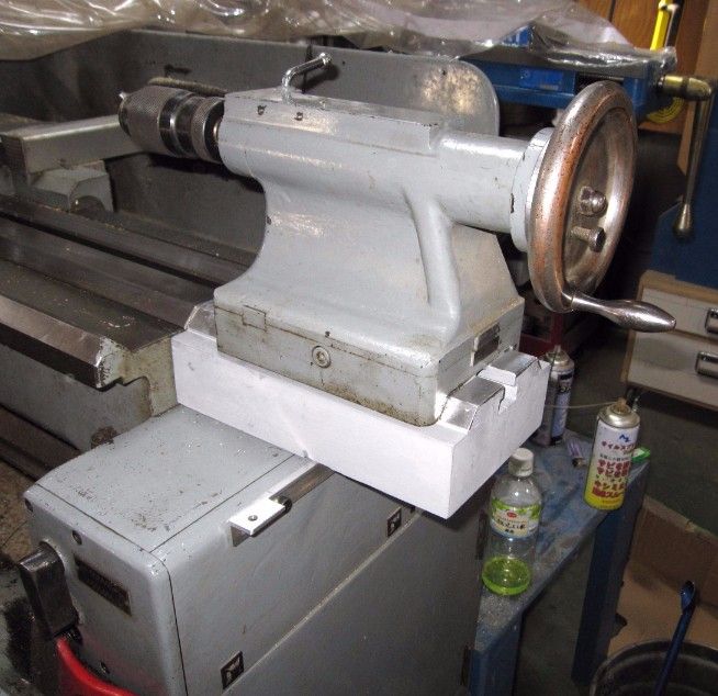 塗り上がったエクステンションをアングルとネジ止めしました。(先端は見えないですが固定した丸棒に突っ込んでいる状態です。)心押台がスライドする面にはアルミテープを貼ってグリースを塗布しています。手前のスペースが勿体無いので・・合板で箱をチョイチョイと作りツールレストにしました。