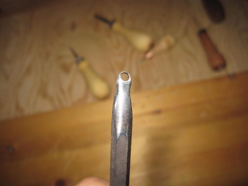 前日に薪ストーブに放り込んでおいた6mmの六角レンチに2.5mmの斜め穴を開け周囲をベルトサンダーなどを使って丸めました。焼戻しされているので簡単に削れます。先端を革砥で研ぎます。穴側は捩ったタコ糸に青棒を塗って磨きました。先日加工したハンドルと合体させました。これで革に縫い溝(グルーバー)入れが出来ます。次は革の穴開け道具にトライしますか・・