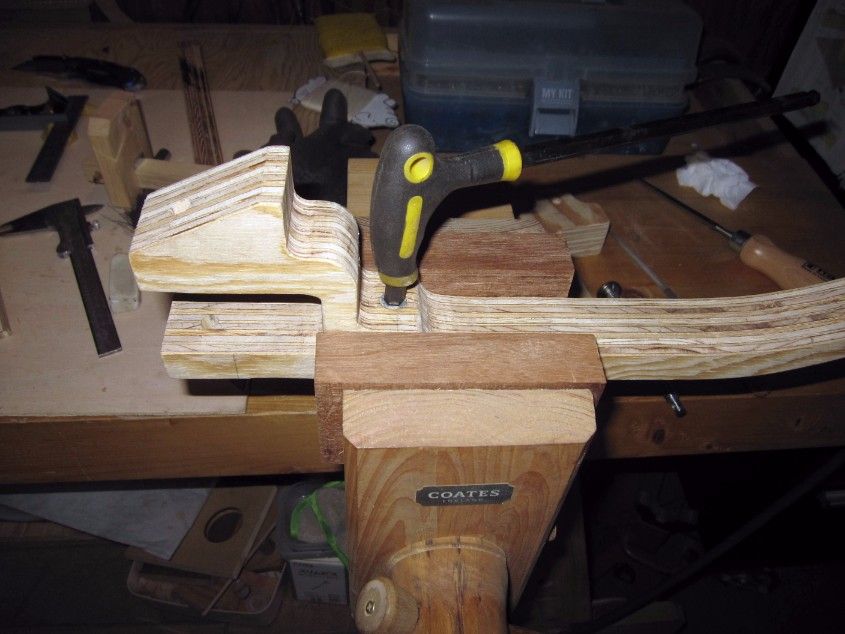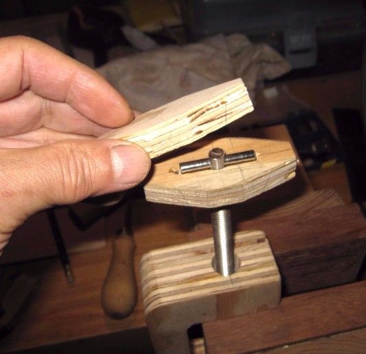 ジョー開閉ネジ用に鬼目ナットを六角レンチでインサートします。3枚合わせのジョーに2枚合わせの物を両サイドに接着します。可動側ジョーはバイスを使い接着中。・・未だ全体は粗い状態です。ジョー幅は12mmx3+12mmx2x2=84mmとお手本より広めになりました。研磨、仮組、調整、研磨と整形を進めます。ほぼ全形が決まって来ました。