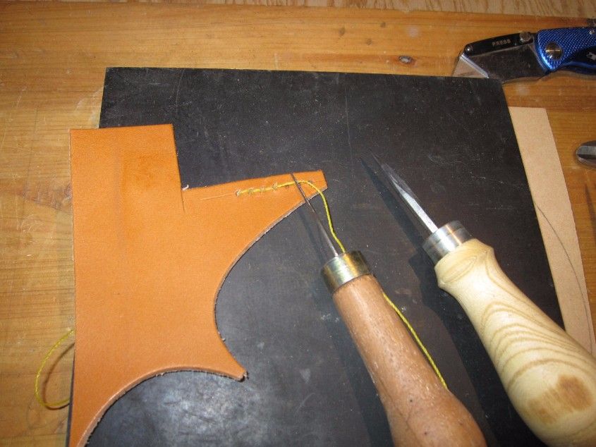 革のハギレに四つ目錐で穴を開けて自作ステッチャーでナイロン糸を試しに縫ってみます。・・・ちゃんと縫い合わせ出来ました。・・次に目打ちも試作してみます。手元にあった平鉄に2.5mmの穴を5mm間隔で開け、バンドソーでスリットを入れ、ベルトサンダーに横から差し込んでスリットを広げて行きます。(大、小のベルトサンダーを作ってから作業効率がグッとアップしました。)最初は刃先を6本で作ってみたのですが革に叩いて見ると貫通抵抗が少し大きいので4本と2本に分断しました。除々にレーザークラフト道具が形になってきています。まだまだ加工の方向性を習作中といった感じでしょうか・・(いずれ工具は既成品も一揃い整える予定です。)さて革を縫う真似事をしてみると両手をフリーにするためのバイスのような治具Stiching Ponyがあれば便利そうだと判り・・デザイン素案を検討中。。