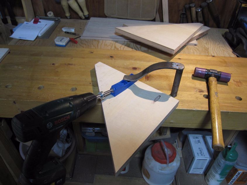 コストコで買って長く使っていたガレージ棚をワークスペースを広げるために強制撤去してみたのですが・・流石に部品などの置き場所に困り、壁面に棚板を追加して行きます。まず棚板を支える側板を作ります。いつものようにMini Kreg Jig kitを使っています。・・板に斜め穴を正確に開けることができ超便利です。(特に2x4材を使った工作には必須と言えるかも・・)まず、上から吊るす形で一段目を作り・・同様に作り、下から支える形で2段目完成です。別途、もう一段作ります。2x4材に斜め留穴を開けます。厚めのベニヤ板を頂いたので、こちらを使います。Boschの12Vインパクトドライバーは組立に十分なパワーがあります。この厚板をバイス付き作業台の棚板として組み付けしました。・・作業工具を置きやすくなりました。今回も頂いた廃材利用で材料費はネジ代くらいです。