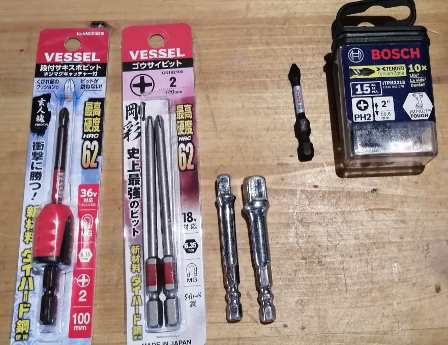 普段、コードレスインパクトドライバーを多用しています。最もカムアウトしないビットはノーマルのVesselだというのは重々承知してますが・・色々使ってみています。最近はUS Amazon から買ったBoschの短いビットを使っています。・・結構、耐久性があり使い易いです。・・使う本体もUS仕様の12Vインパクトです。・・エクステンションでも使いますが・・別途、長いビットも使います。手元の長いビットが破損したり摩耗してきたので・・今回はVesselのHRC62という刃物級の硬度のビットをアスクルに注文しました。一つは強磁石付きです。(18V対応とか36V対応とかはただの宣伝文句ですよ〜。。)昔は写真のソケットビットのようにUS,日本共用のビットも(クビレ2箇所)在りましたが今は殆ど見かけません。国産ビットは、そのままですとUSインパクトのアンビルにロック出来ません。加工のため、旋盤にちょっと強引にディスクグラインダーをセットしました。旋盤を逆転させながら薄いディスクで溝入れします。ビットにクビレを追加できたので左のUS仕様12Vインパクトドライバーにも右側の日本仕様18Vインパクトドライバーにも共用可能となりました。こんな手数をかけるのも、何と言ってもUSのパワーツールは圧倒的に安価だからです。一時値段がアップしてましたが現在、送料込124ドルです。。