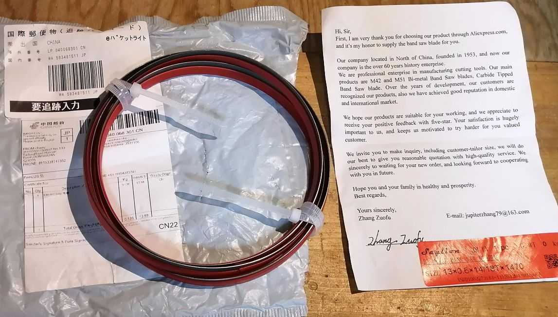 1ヶ月程前の事ですが・・バンドソーIKURA TN-100で金属をカットしていた処・・バンッ!!と大きな音がしてブレードが破断してしまいました。点検すると・・刃こぼれも多々あり・・寿命でした.国内調達だと・・5本パックで結構なお値段です。そこで単品でAliExpressに注文しました。--1500円程度。。一応、材質はM42コバルトハイスで14/18不等ピッチの物を選んでみましたので品質は多分大丈夫でしょう。。発注後1ヶ月程度で入荷しました。刃はカバーされて送られて来ました。挨拶状も入っておりその英文もChinglishじゃなく、ちゃんとしています。荷解きして点検・・カメラのピントが合ってませんが・・ちゃんとコンビネーションピッチでした。普通、ブレードの接合部は研磨痕が残ってますが、こちらはほぼ判らないです。バンドソーに取り付けて試運転します。特に問題無いです。今までの物より静かに回っています。こうした量産消耗品は支那製で十分ですね。DIYですから・・(^_^)v