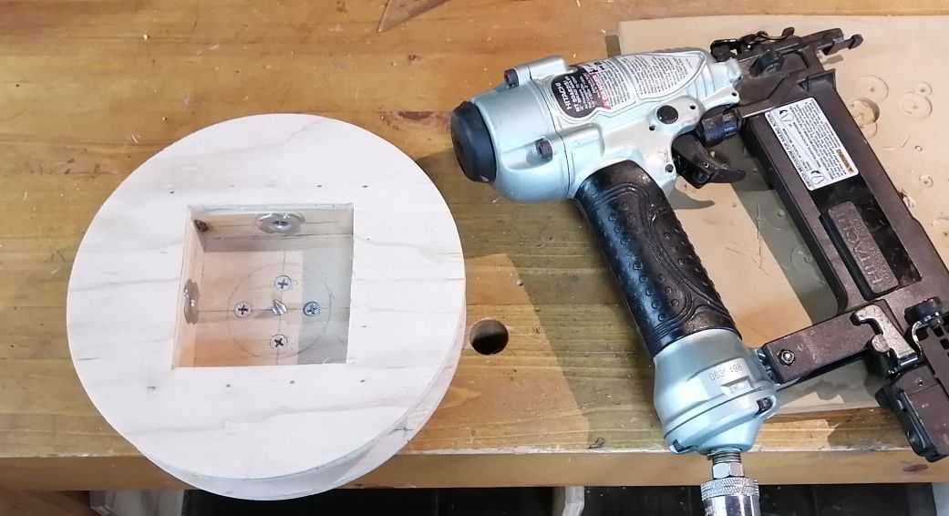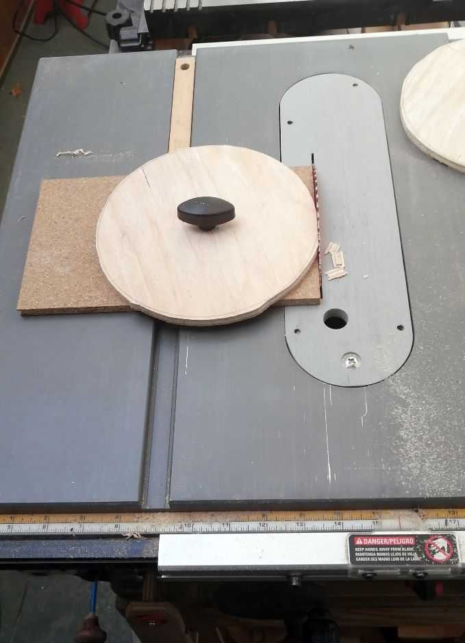 バンドソーを使い合板からラフな円板を直径180mm程度で切り抜きました。円板を治具に付けてテーブルソー上で接線方向にスライドしつつカットしました。最後はグルグル廻してあげれば綺麗な円盤の出来上がりです。😊円板に枡枠を接着・ネジドメします。枡の内寸は80x80mmにしました。爪付きTナットへの押しネジで切削材を支持する形です。押しネジがふらつかないように・・枡枠部分にも貫通ネジ穴加工を施しました。💡中央に「センター押し」を配し、接着・ネジドメしました。三つ爪にチャッキングされる側の様子です。・・木工ボンド乾燥中・・・・続く・・