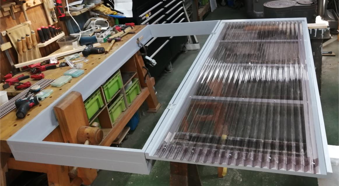 外枠に被せる薄いドアを作りポリカ波板を留めました。