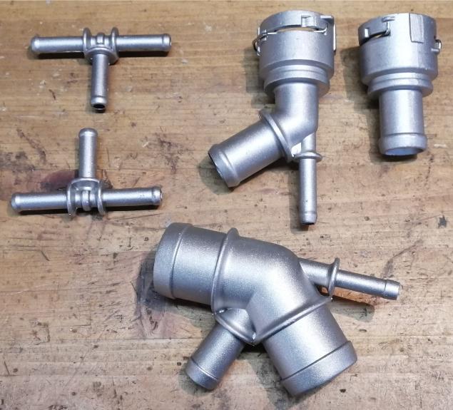 先日、サーモハウジングからのクーラント漏れで一汗かいたのでこの辺で他のプラスチック爆弾も処理しようと思います。 😂やはりVW専門店でもゴルフ4の水廻り修理は多くhttps://ameblo.jp/sammotors/theme-10023485567.html・・プラスチック配管パーツが破断する事があるので・・アリエクで購入したアルミ製代替部品と交換します。最初にT字配管2個とラジエター側に接続される4分技管を交換しました。取り外した部品は意外と未だシッカリしてる感じですが製造から齢20年ですから、交換で良いでしょう。 😉次に写真右上2個を交換するためダッシュパネルにあるヒーターコアの出入り口ホースを取り外しました。そして・・カップラーを抜き取ろうとしましたがOリングの固着が強く、どうしても取れませんでした。無理すればヒーターコアに害が及ぶ可能性もあるので残念ですが・・そのまま現状とします。 😓太い配管は折れる事はないでしょうが・・結局細い管が1本残る事になりました。万一折れた際には穴にネジを締め込んで緊急対応しようと思います。 こんな風に↓↓ 😁https://ameblo.jp/sammotors/entry-12200258543.html?frm=theme