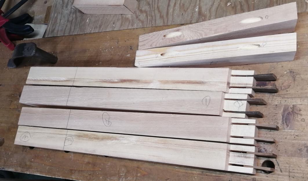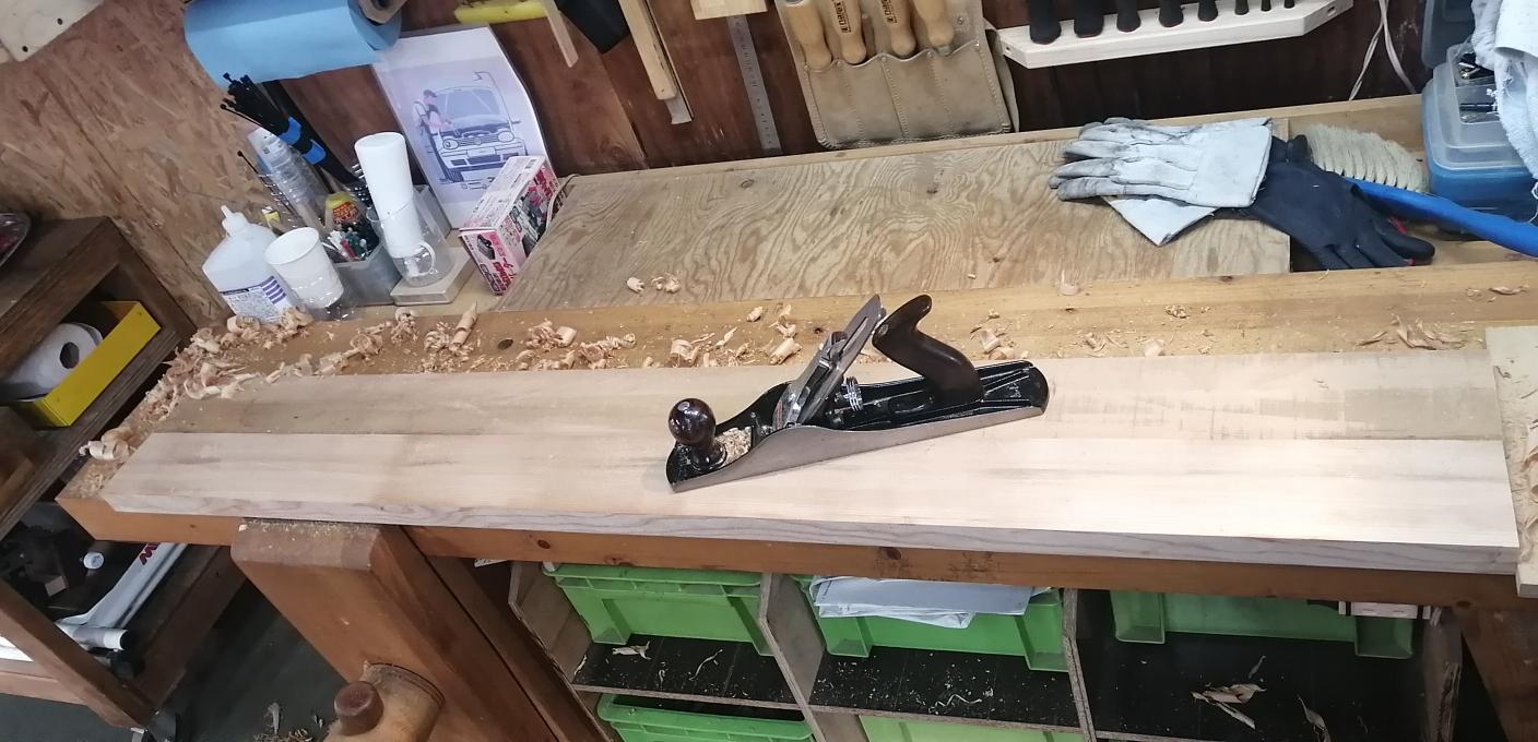 接着された2枚の板は反りがバラバラでなのでプレーニングします。最初は少し長めの洋式鉋・ジャックプレーンで粗削りしました。続いて表裏・側面を4番鉋で仕上げて行きました。少しづつ数日かけて仕上げています。平板らしくなったところで脚用の穴を開けます。印をノミで入れて穴開けですが・・脚の傾斜角15度に沿った穴開けなので・・Uuummm 難しいです。 🥹15度の傾斜を付けた端材を基準にして加工して行きます。最初の角穴を開けるのは、かなり時間が掛かりました。 😅残りの3個は感覚が掴めて来て、割と早く開ける事が出来ました。脚用の角材を用意して各穴に突き合わせて挿入出来るように加工しました。脚に横桟を入れるために仮組みして位置決めしラインを入れます。やっと全体像が見えて来ました。😀これから仕上げ加工に進みます。・・・続く・・・