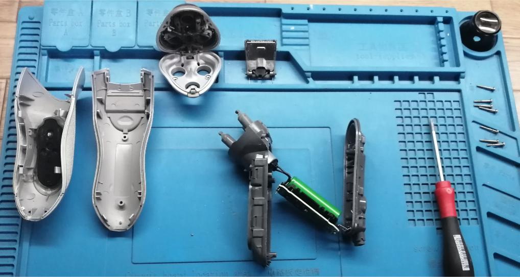普段、フィリップスのシェーバーを使っていますが髭剃りの力が徐々に少し落ちてきたように感じます。・・未だ使えるのですが対策しておこうと思います。まずは、現在使用中の製品の、前に使っていたフィリシェーブを試しに分解、電池交換をやってみようと思います。分解は難しいかと思いきや・・道具はT8のドライバーと殻割用ナイフくらいで簡単でした。・・如何にも3DCADで設計しました的な合理的な構造です。バッテリーはUS14500Vというリチウム電池でしたので同等品のお安い製品をヤフショで注文しました。https://store.shopping.yahoo.co.jp/market1234/202304141807.htmlこの電池はタブの無い棒状なので、昨年6月に作成したミニ・スポット溶接機の出番がやっと来ました。😁・・電池を木製バイスで抑えておいてタブを溶接しました。従来の電池のタブをニッパーでカットし新電池を継ぎ足し・ハンダ付けしました。全体を組戻して充電してみます。・・・OK 充電できました。😀・・使ってみましたが普通に使えています。安価な電池で復活出来て良かったです。😆
