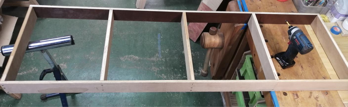 春ですね〜。。ガレージ内を少し片付けていて、壁に棚を追加したりサブテーブル的な平机も端材で作ってみることにしました。 😀最初に天板を載せる・ラダーフレーム400x1400mmをねじ留めで作りました。脚は2枚の板を90度に接合して作りますが・・テーパー形状としたく簡単・綺麗ににカットするためにテーブルソー用にテーパリング治具150x900mmを写真の用な形状で作ってみました。脚の素材板を4枚重ねてテーパー治具にセットしてテーブルソーで不要部分を切り落としました。次に裏返した素材板を4枚重ねてカットし都合8枚の脚材を準備しました。 😀次に、脚をフレームにピンネイルで仮組みしてみました。・・これで大丈夫そうです。 😀天板450x1450mmを用意してラダーフレームにピンネイルでビシバシ留めて形になりました。 😀天板をサンディングしてから米油をヌリヌリします。出来上がりました。! ガレージの片付け用ですからこの位の仕上がり感でも十分かと思います。😁