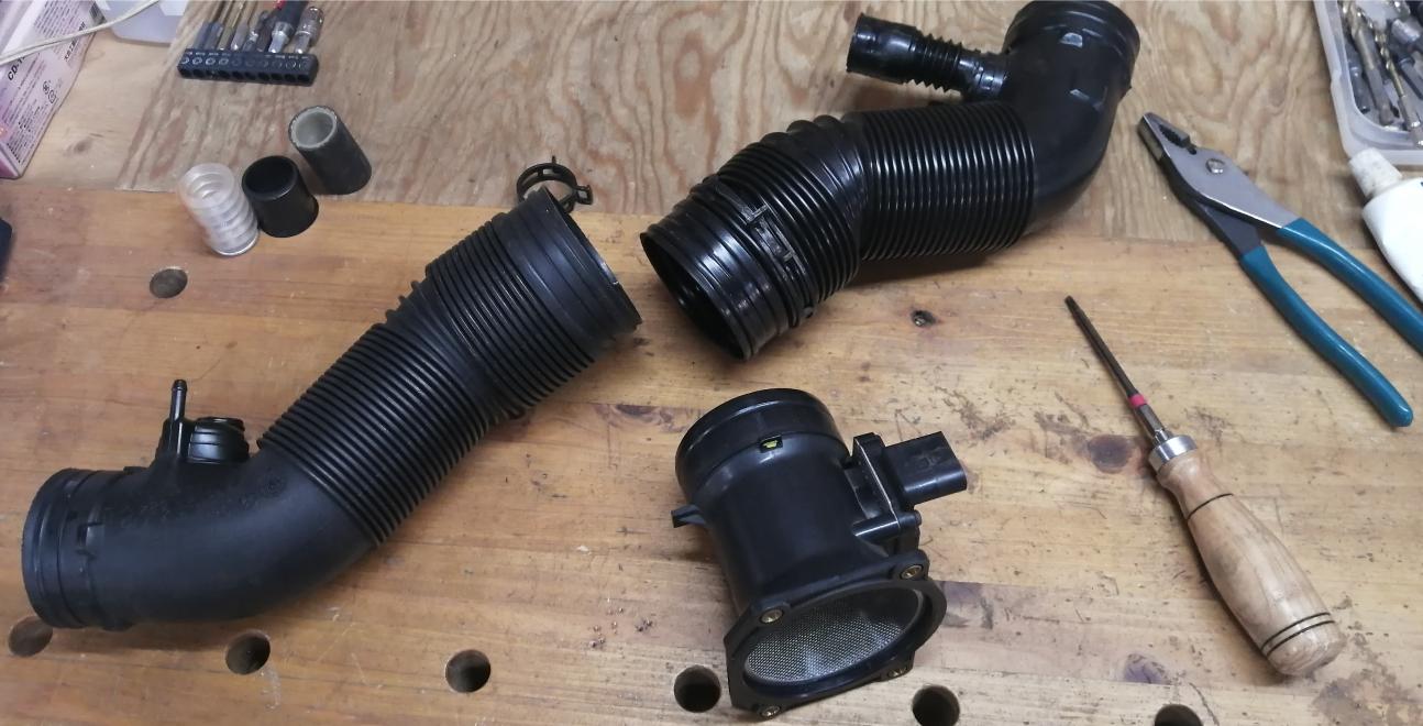 吸気のインテークパイプは現状、支那製のパイプに交換してありますが・・全体的にプラスチックが硬いのでエアクリーナボックスにストレスが掛かっています。🥴そこで古い純正品を手直ししてみようと考えました。インテークパイプの切れた細い蛇腹部分(ブローバイガス接続口)にアルミパイプを嵌合してダイソーの2液エポキシで接着した処へ手元にあったゴムホースでナントカ接続しました。😁ホースバンドはスプリングホースクランプが標準ですが・・そのバネが強く、脱着時大変なので普通のホースバンドに交換しておきました。 😀