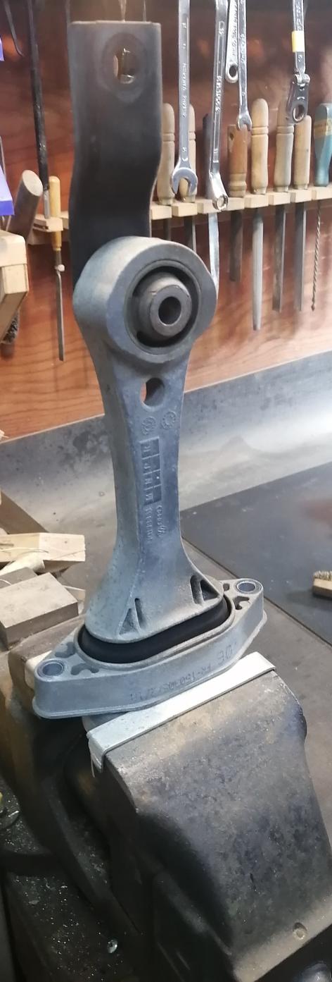 そろそろエンジンマウントの状態が気になって来たので点検してみようと思います。まずは、リフトアップしてドッグボーンマウントを取り外します。ネジ頭にカラーペンで締まり位置の目印を入れてから、インパクトレンチで取り外しました。(16mmx2, 13mmx2)バイスに咥えてゴムブッシュの目視点検・・良好先端を持って前後・左右の自由性・・良好先端を持って上下の動き無し・・良好(エンジン前後の動き抑制)こちらに関しては未だ十分使えそうなので、軽く清掃して再利用します。取付は超ロングメガネを使ってネジを元の位置まで締め込みました。😀続いて・・車を着地させてからエアクリーナーボックス周辺を取り外しミッションマウントを露わにします。オートマ下部に当板をあてて軽くジャッキアップしておきボルト位置とマウントの位置に印を書いておいて18mmボルトをインパクトで緩めました。一見すると、劣化しているようには見えませんが・・エンジンマウント側だけを持って動かしてみると・・片手で意外に軽く動いちゃいます。・・やはり、ソレナリに軟化してるようです。😅組戻しは目印まで・・(結構キツイです。)1/2"ロングラチェットで締めました。さて肝心の右側のマウントですが・・中央下側のゴムブロックがアルミハウジングにホボホボ、接地しています。こちらは取り外すまでも無く、交換した方が良さそうです。ということで・・マウントを2種注文します。(1J0 199 262 BE ,1J0 199 555 AJ) 銘柄はCORTECO(純正メーカ)かMeyleにしようと思います。・・そのうち暖かくなってくると整備項目が目白押しです。😁