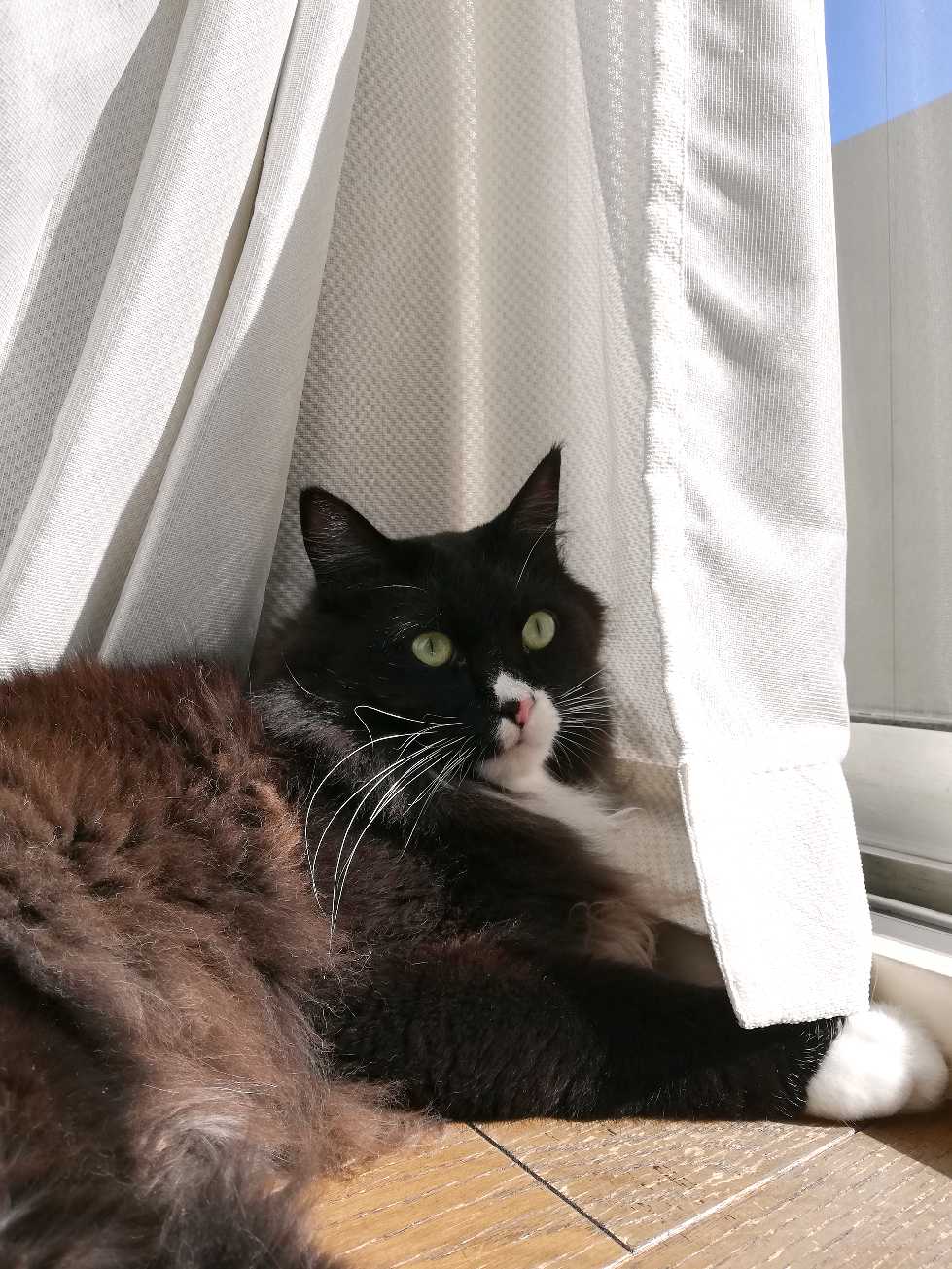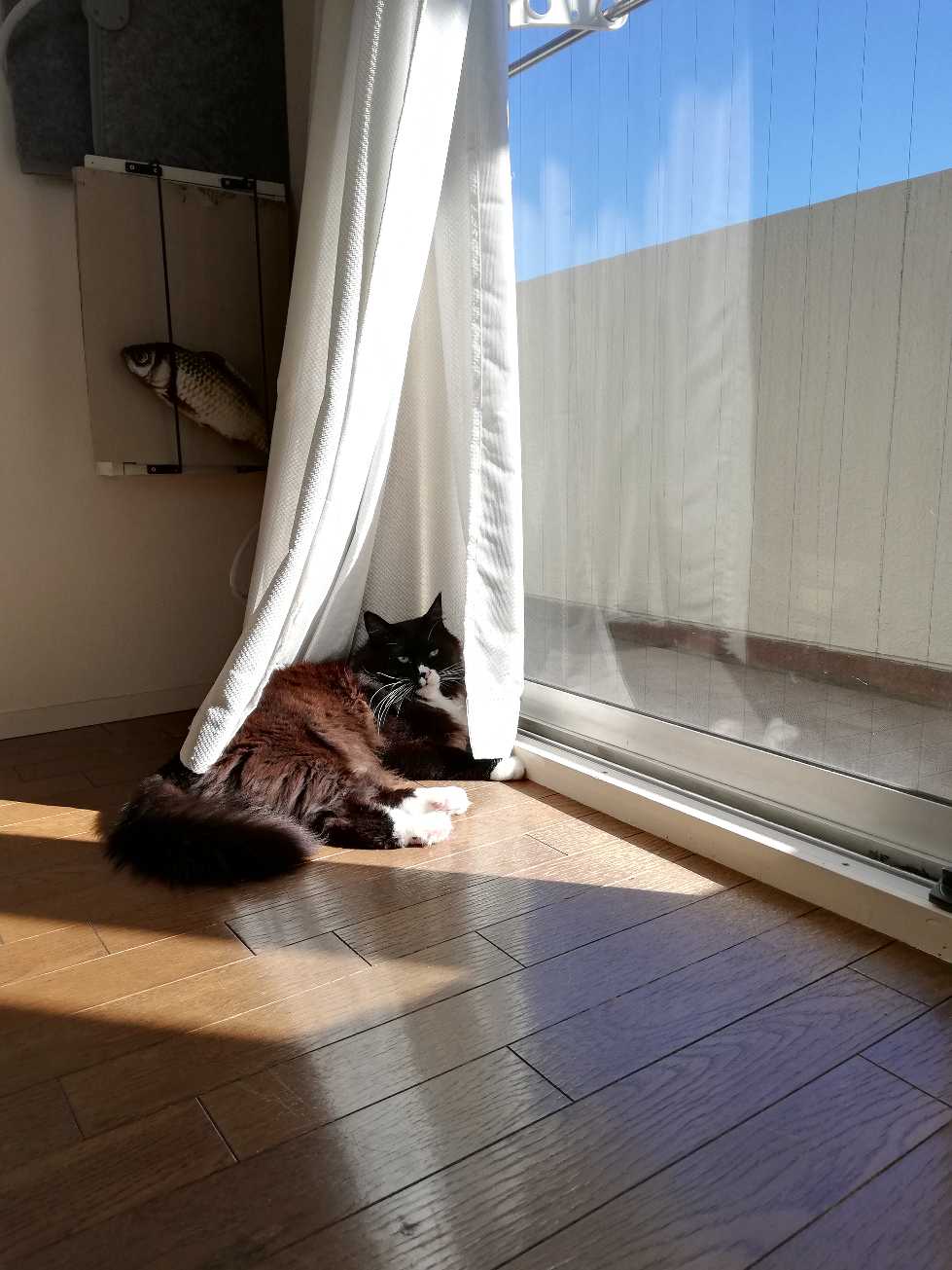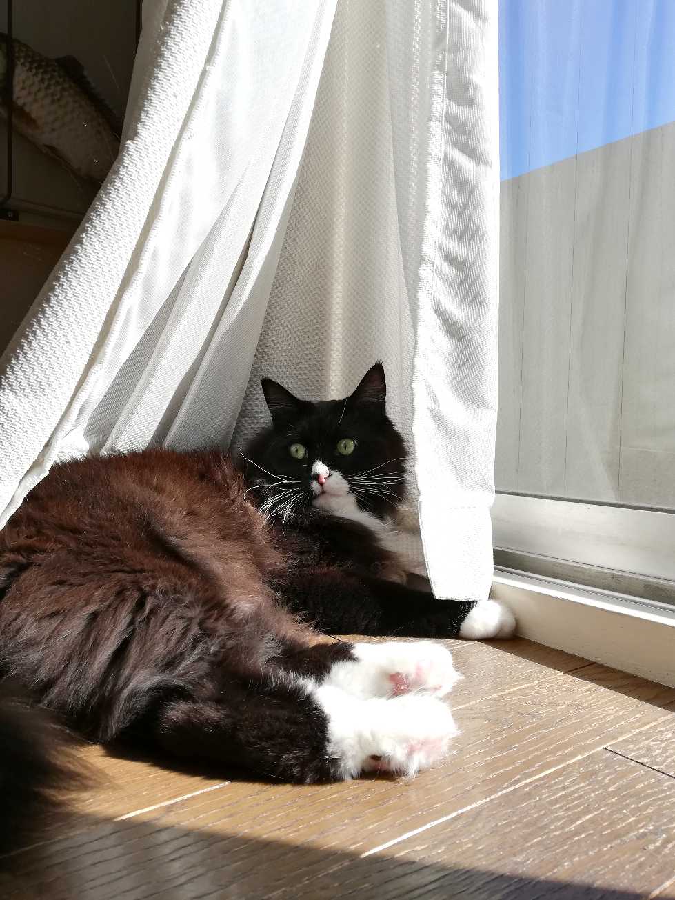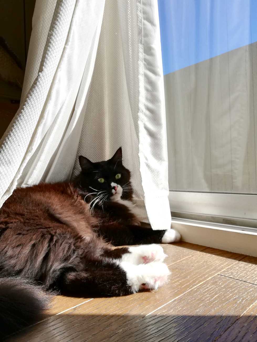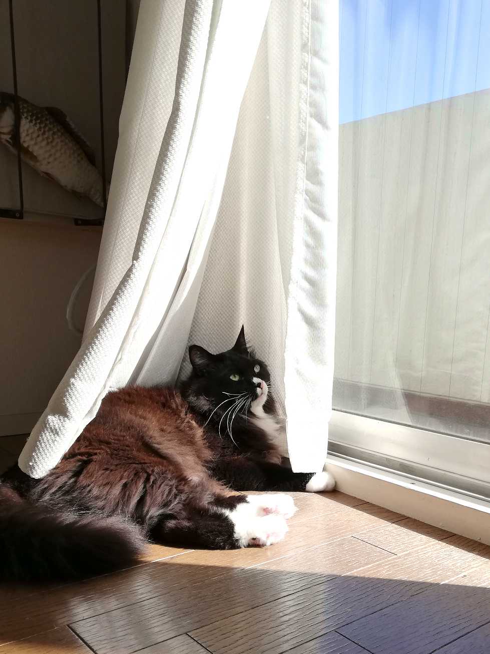 カーテンで個室気分のくーちゃん。