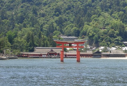厳島神社の朱色が海と初夏の緑に映えてとても美しい風景でした。
