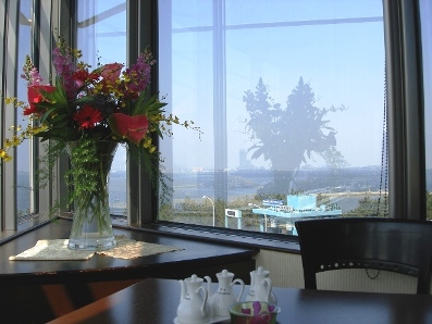 ガラス越しにあたたかい日差し、空と同じ色の海、