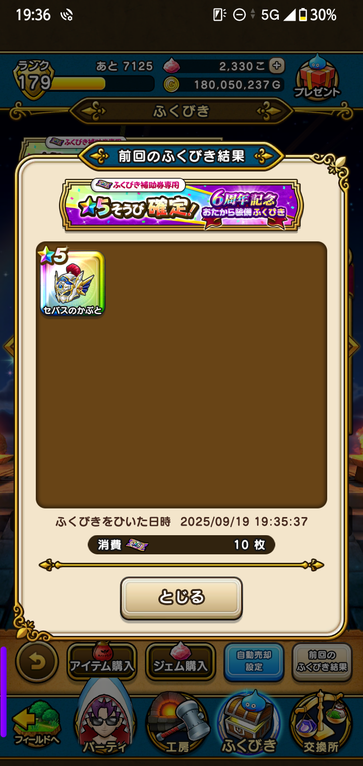 ドラゴンクエストウォーク!ドラクエウォーク!6周年記念おたから装備ふくびき!☆5そうび確定1回と、10連1回!6周年記念ふくびき!10連1回!セバスのかぶと!世界樹の鎧上【滅】!新!王宮魔術師帽!ひかりのタクト!☆5装備は、4つ出たけど、1つは確定ふくびき!最新防具は出たけど、武器は出ないね!相変わらずの、火力不足で、強い敵は倒せない!10連×180回=1800連で、☆5装備は、126個!☆5装備出現率は、7%!!!!!!!体感的に、☆5装備の出現率が悪くて、本当に7%もあるの?という疑いから始めたこの企画!1800連目でついに、7%となりました!本当に、7%だったんだ!そいつぁよかった!ドラゴンクエストウォーク 公式ファンブック 5th Anniversary [ スクウェア・エニックス ]