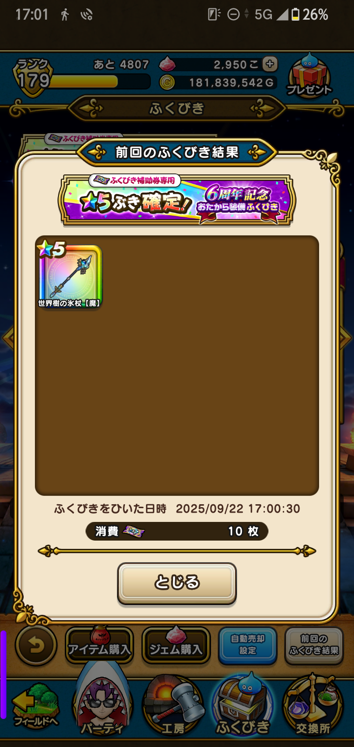 ドラクエウォーク!ドラゴンクエストウォーク!6周年記念ふくびき!安定の、☆5装備ゼロ!10連×181回=1810連で、☆5装備は、126個!☆5装備出現率は、6.9613259%!前回やっと7%になったのに!てか、これまだ続けるの?そいつぁよかった!ドラゴンクエストウォーク 公式ファンブック 5th Anniversary [ スクウェア・エニックス ]