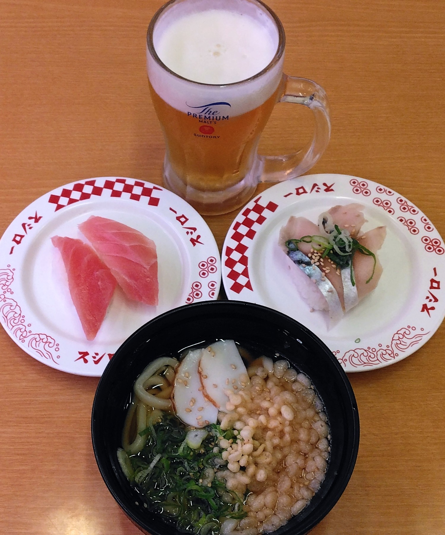 今週も、スシロー!1周目のオーダー!生ビールジョッキ〆さば(ごま・ネギ)厳選まぐろ赤身かけうどんもう、いつも同じ!でも、同時に注文すると、生ビールが先に来て、かけうどんが来るまで結構タイムラグがあって、写真を撮る為に全部揃うのを待っていたら、ビールの泡が消えちゃうという問題がありました!そこで、うどんを先に注文して、寿司を注文して、最後にビールを注文するという、時間差攻撃を思いついて、実践してみたら、なかなかいい感じに届きました!かけうどんの優しい味が、染みるんだなぁ!2周目のオーダー!うずらフライ軍艦小粒納豆巻(ネギ抜き)こだわりハンバーグにぎりコウイカお気に入りのコウイカ!肉はハンバーグで!納豆巻で、大豆と海藻!今日の卵は、うずらフライ!3周目のオーダー!ショコラケーキ+アイスコーヒーセットまぐろカツ(一品)かぼちゃの天ぷら角ハイボールやっぱり食欲が戻ってきたのか、3周目に行きました!角ハイボールと、つまみは揚げ物!かぼちゃの天ぷらに、まぐろカツ!どちらも旨いが、特にまぐろカツが、安くて旨かった!デザートに、ショコラケーキとアイスコーヒー!ショコラケーキは、ますます小さくなった気がする!小計、2,740円!シニア5%off、-137円!d払い、2,603円!dポイント充当、28ポイント!電話料金合算払い、2,575円!獲得予定dポイント、12ポイント!そいつぁよかった!おうちでスシロー すし皿BOOK