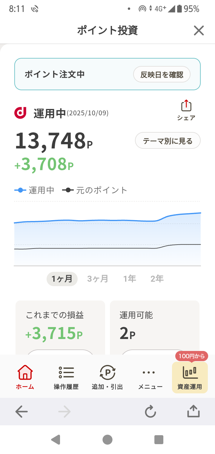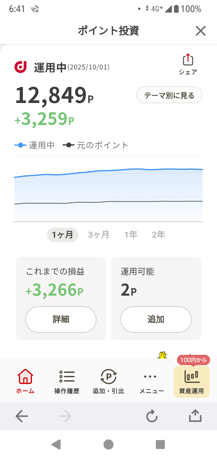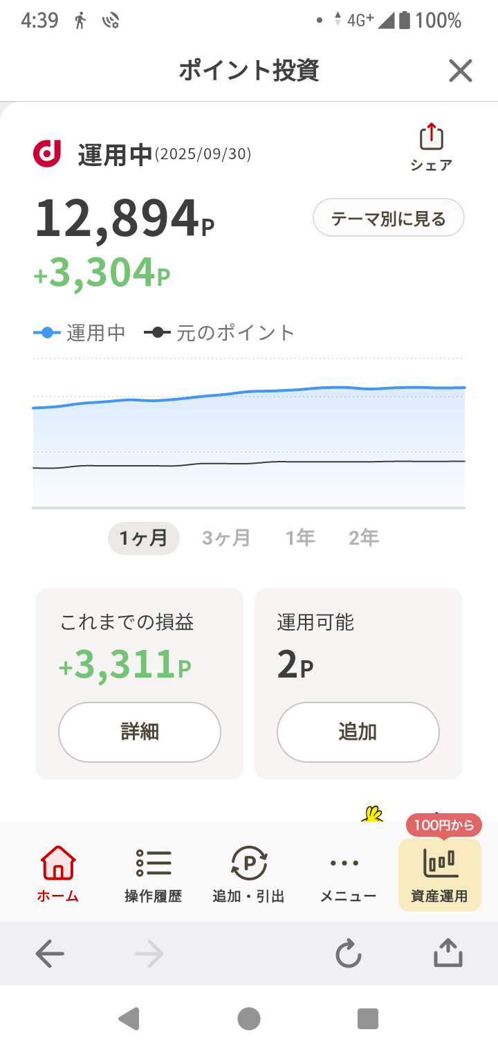 ポイント運用!ポイ活!dポイント、214P増、310P追加!楽天ポイント!利息プラス、17P追加!ポイント運用、59P増!ポイントビットコイン、158P増!ポイント楽天株、104P増!合計、321P増、17P追加!合わせて、535P増、327P追加で、862ポイント増えました!いやあ、たまたまりそなクラブポイントからの300ポイントの追加も重なったけど、運用分だけでも、535ポイント増は、大きいね!残高は、37,455ポイントで、9日連続最高記録更新!高市早苗効果抜群!ちょうど1年前の、2024年10月7日の残高は、9,028ポイントだったから、この1年で、28,427ポイント増えて、4倍以上になった!増えたのは2万8千ポイントだけど、1年で4倍ってすごくない?1年後には、15万、2年後には、60万、3年後には、240万になっちゃうよ!捕らぬ狸の皮算用!そいつぁよかった!元手0円で増やせる!ポイント運用【電子書籍】[ ダイヤモンド・ザイ編集部 ]