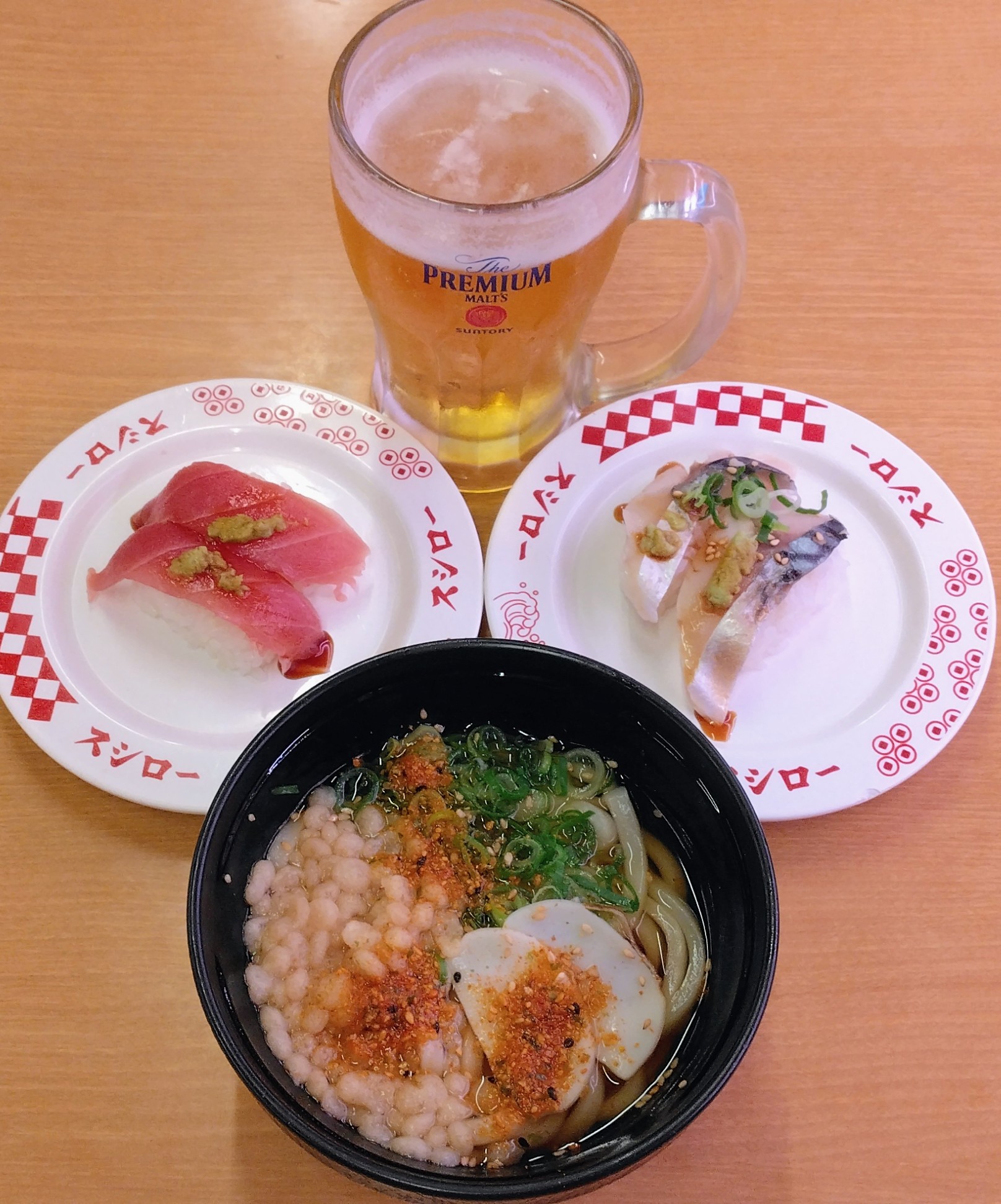 スシロー!最近、肉より魚が食べたくなるのよね!歳のせいかしら!あと6回で、3度目のまいど盛り!このまま週2のペースだと、3週間だ!1周目のオーダー!生ビールジョッキ厳選まぐろ赤身いか明太子のせかけうどん今回も、時間差注文したけれど、うどんが来るまでに、ビールの泡は、消えてしまいました!うどんが来てからビールを注文してもいいかも!最初はまぐろ!いか明太子も旨かった!でも、イカが噛み切れない!コウイカみたいに、歯切れが良いといいんだけど!うどんはやさしい味で、美味しいなあ!七味は2袋かけるけど!2周目のオーダー!小粒納豆巻(ネギ抜き)シーサラダ軍艦えび+たまご生ハム今日は何故か、シーサラダが食べたかった!3周目のオーダー!グリルチキン焼肉だれフライドポテト活〆はまち角ハイボール最後は、角ハイボールと!小計、2,470円!シニア5%off、-124円!d払い、2,346円!dポイント充当、78ポイント!電話料金合算払い、2,268円!獲得予定dポイント、11ポイント!そいつぁよかった!おうちでスシロー すし皿BOOK