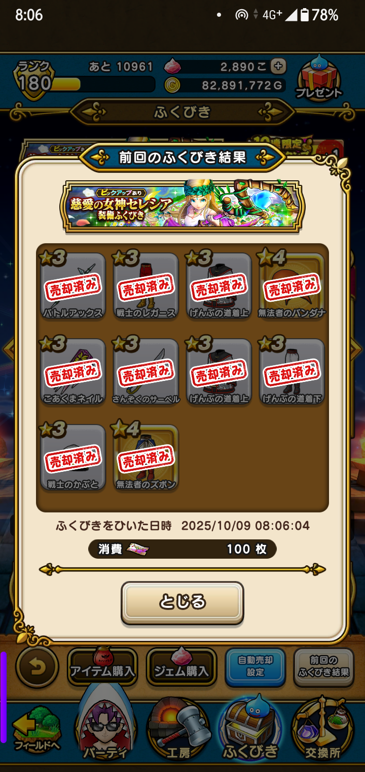 ドラクエウォーク!ドラゴンクエストウォーク!慈愛の女神セレシア装備ふくびき!相変わらず、ガッカリの結果!最新装備、特に武器の出現率は、もう1年ぐらい0%のような気がする!調べてみる気力も湧かない!10連×188回=1880連で、☆5装備は、129個!☆5装備出現率は、6.8617021%!低下の一途です!そいつぁよかった!ドラゴンクエストウォーク 公式ファンブック 5th Anniversary [ スクウェア・エニックス ]