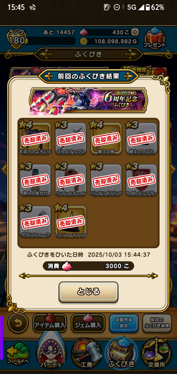 ドラゴンクエストウォーク!ドラクエウォーク!6周年記念ふくびき!6周年記念おたから装備ふくびき!やっぱり、最新装備は、当たる気配が、全くない!10連×187回=1870連で、☆5装備は、129個!☆5装備出現率は、6.8983957%!どんどん下がり続けております!そいつぁよかった!ドラゴンクエストウォーク 公式ファンブック 5th Anniversary [ スクウェア・エニックス ]