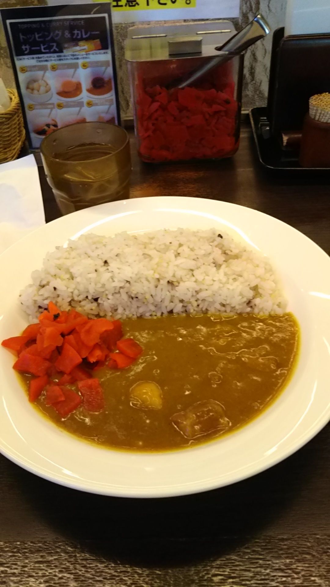 食券自販機の前の人が時間がかかりそうだったので、食券買わずにサービス券10枚でポークカレー!
