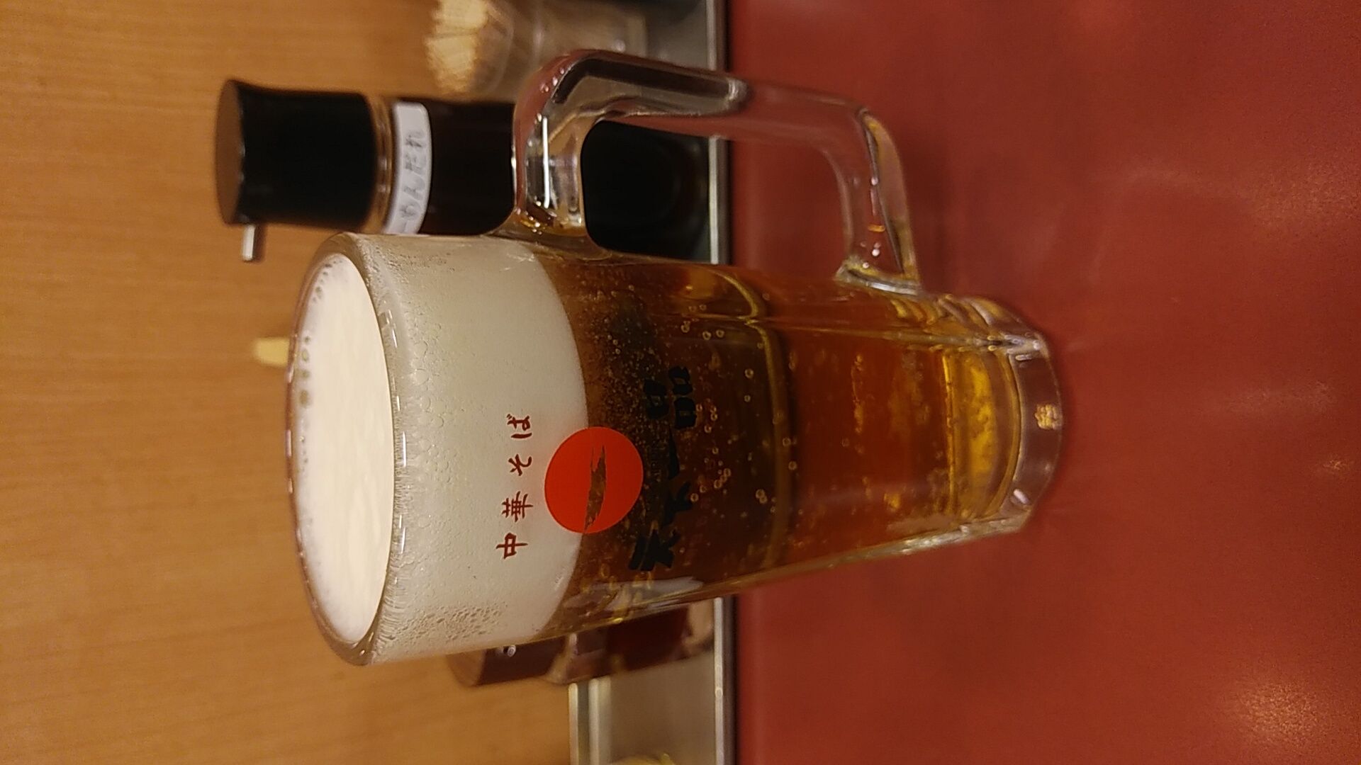 メニューの写真が大きいジョッキだったので、てっきりこのジョッキで出て来るもんだと思って注文したら、小さいジョッキでガッカリ!