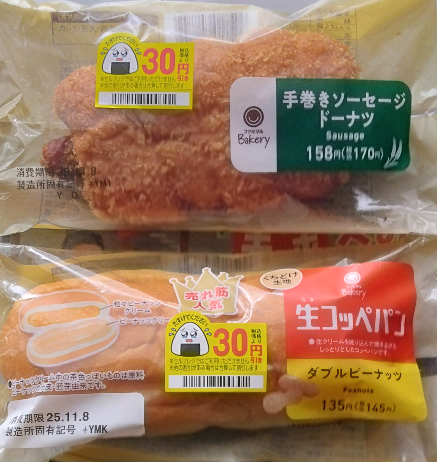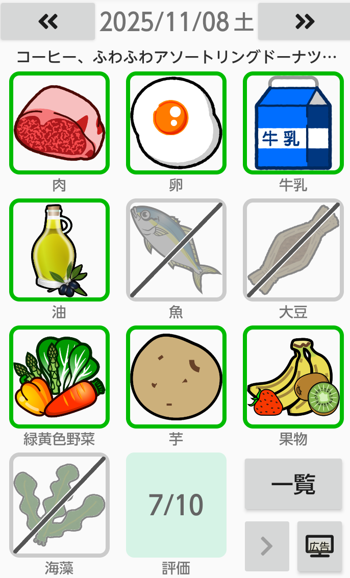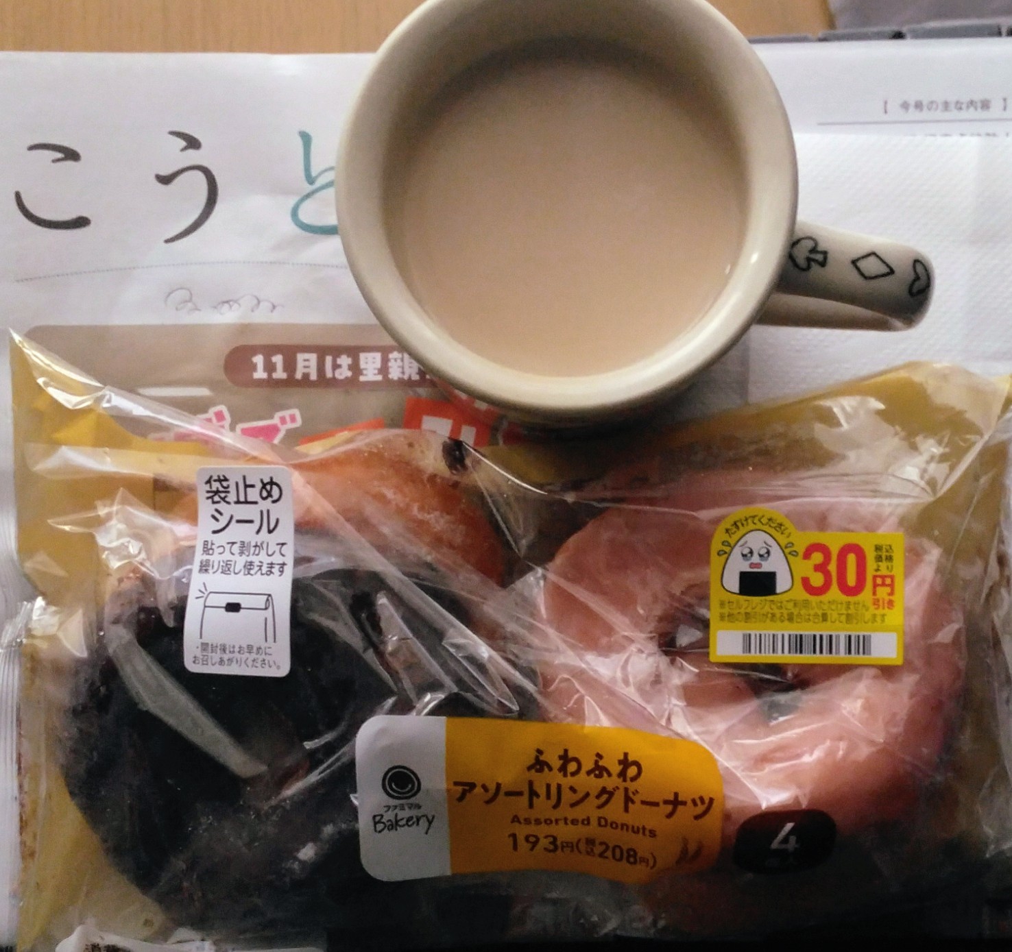 朝、コーヒー、ふわふわアソートリングドーナツ(油)、牛乳(牛乳)、野菜生活100ベリーサラダ(緑黄色野菜、芋、果物)手巻きソーセージドーナツ(肉)!