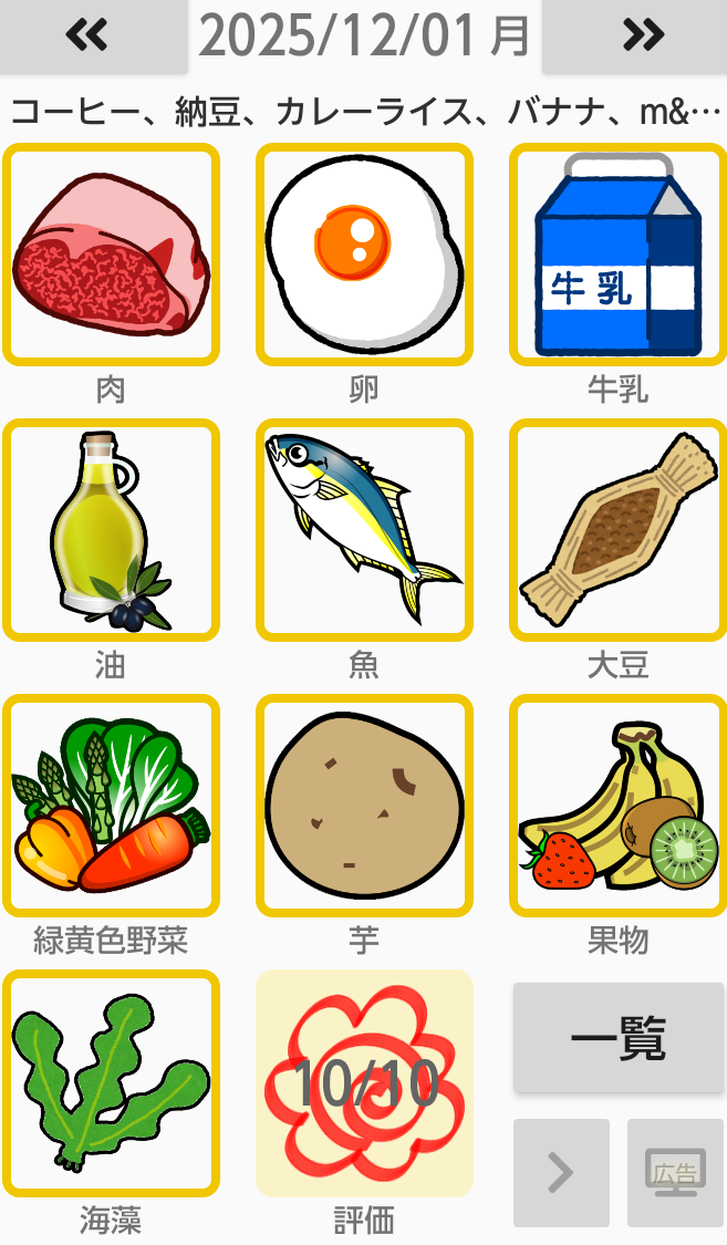 朝、コーヒー、納豆(大豆)、カレーライス(芋)、バナナ(果物)!