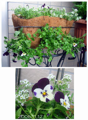 昨日のポッポーに種蒔き苗をやられてから、ムカつき解消に3ポット 100円の苗を買って来てハンキングを作りました あーすっきり まずは3色のビオラのハンキング合計8苗使いました コチラは深いグレープ色のツートンビオラと白のスィートアリッサム 白のバコパの計6苗でーす アリッサムが垂れ下がって こんもり咲いてくれるのを期待しています 良い香りを漂わせてくれていますがスィートアリッサムの香り、 白花が一番良い香りに思うのは気のせいかしら さっき一瞬小雨が降りましたが今はお天気になってきました 今日のお弁当 アホの1つ覚え、半熟玉子 大好きな韓国海苔&アジフライ弁当~