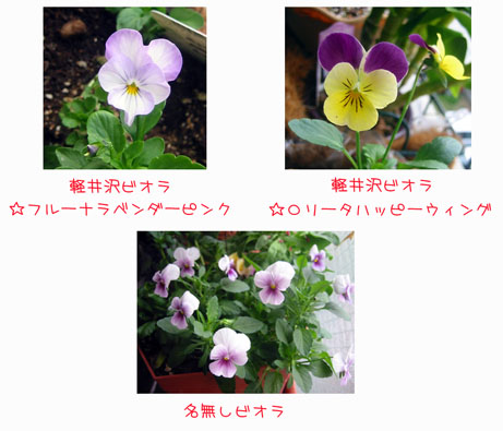 下中央の名無しビオラは寄せ植えしているのですがとっても可愛らしく