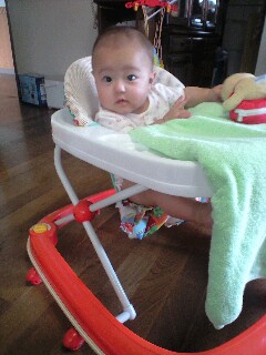 おさがりで貰った歩行器に乗せてみました(^-^)