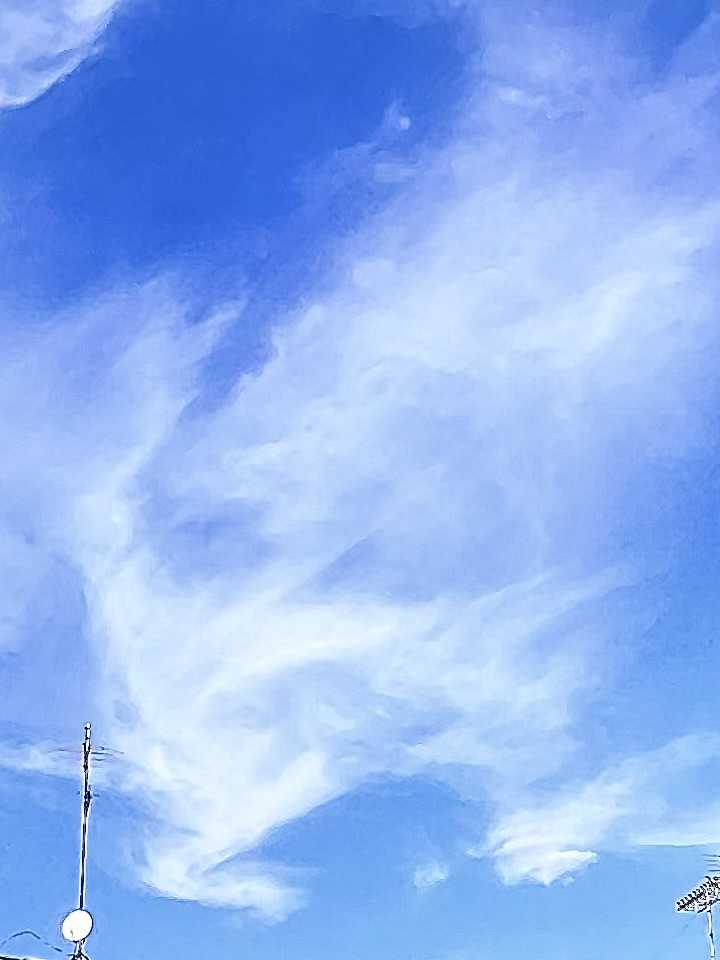今日はインフルエンザの予防接種に出かけました。道すがらふと見上げると、澄み渡った青空に「つがいの鳳凰」… に見えなくもない雲と、「龍」… に見えなくもない雲が浮かんでいました。 すかさずパチリ 📷 このところ世界各地での災害や津波、全銀システムの障害などなど重苦しいニュースが巷にあふれていますが、「悲しいことばかりではない。何かいいことが起きるかも‼️ 」とちょっぴり「スピリチュアルな気分」になって、思わずニコッとしたくなるようなきれいな青空でした。私は空を見上げて、写真を撮るのが好きです。いろいろな楽しい形の雲や彩雲、我が家のベランダからはハロ現象の写真も撮れました。意外にシャッターチャンスはあるものですね。横浜市中区のオフィス街から望むハート型の雲は、私のお気に入りの1枚です。写真はすべて1眼レフのカメラなどではなく iPhone からなのでそれなりですが、私はまぁまぁ満足しています。私は、空にロマンとスピリチュアリティを感じます。空を見上げると、澄んだ青空を見ると晴れやかな気分になります。みなさんはいかがですか?最後に、フランス、シャンパーニュ地方のランスで撮ったとっておきの1枚です。 ハンサムガイ? 天使の横顔? フランスの空に浮かぶ巨大な顔は やっぱり鼻が高かった ‼️ 😄 日本ならどんな顔になるのかしら?全銀システム障害はまだまだ解決できないようですが、長引けば、企業にもいろいろ支障が出てきますね。一刻も早く障害が回復しますように。