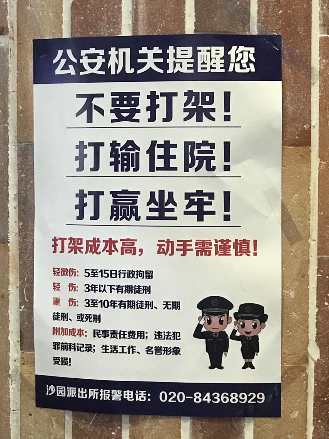 中国の公安局からこんなユーモラスな広告が!笑なんだか時代の変化を感じます。。。警察機関からの注意ケンカをしないように負ければ入院勝てば牢屋行きケンカをするのはコスト高手を出すことには慎重に微軽傷 5から15日の勾留軽傷 3年以下の有期刑重傷 3年から10年の有期刑、無期懲役、あるいは死刑追加コスト民事責任の費用、犯罪前科記録、生活、仕事、名誉毀損中国の人に対して、けっこう有効なポスターな気がします。。。