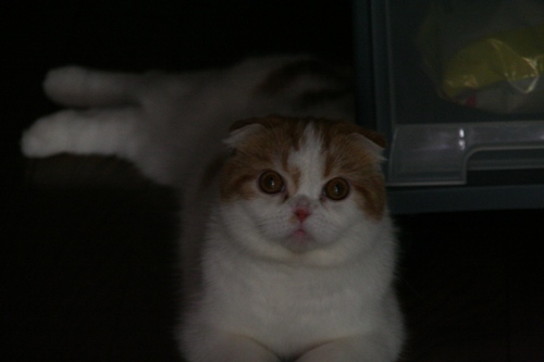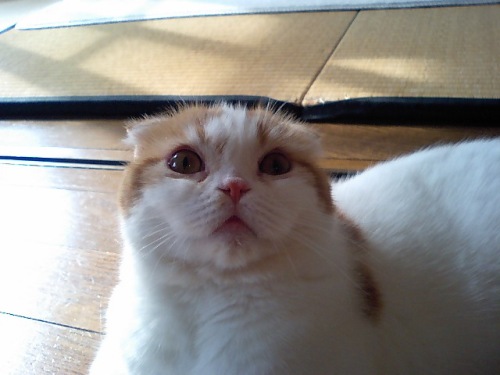 「たいくつにゃの~~遊んでにゃ~~~~」甘えたか細い声で「みゃぁぁぁぁ」と訴える姫。(もともと声が小さくてあまりおしゃべりしないんですが、手術後、前よりおしゃべりするようになりました。その分ツンデレ度が増してる??)はいはい、姫君。今日はこれ↓で遊べばよろしいので?投げてやるとすっ飛んで行き、わざと自分では取れないような場所に入れては私を呼びつけ、「はいはい」と取ってまた投げてやるとまたすっ飛んで行き……。それが姫の飽きるまで繰り返されます(wただ投げるのもつまらないので、今日は写真を撮ってみました「みゃ!ママちゃん、にゃに撮ってるにゃ!?」あっら~、ばれちゃった暗いところだと大丈夫とでも思ったんですかね~残念ながらこれが撮れちゃうんだなにゃんこもびっくりすると「にゃっ」って声立てるんだあでも、このあと、息子の部屋のベッド下にもぐりこんじゃいましたカメラを意識しても、可愛い顔撮らせてくれるようにならないかなあ……。