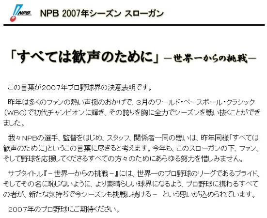球界他事ログ=2007年3月7日(水曜日)赤口=本ブログはプロ野球関連記事を読んで、私的感想、批評、罵声、反省を書いて行きます(編集人:G一筋ウン十年 末裔まで巨人な古馬道)文章の取り方は人様々ですが・・・ すでに”出落ち”している我が巨人のニュースソースは横に置いて、(会田投手は素晴らしい!)たまには違う視点の内容でも書いてみようかと、夜のこの時間にヒマが出来てブログ用PCに向かっております。 楽天の福盛投手のブログでの出来事を述べてみたいと思います。 私的に”巨人命”な小生も「隠れ楽天ファン」で、実のところスカパー加入の動機も楽天の試合を見たいが為に、というのも一つの要因です。昨年6月に小生の田舎でもある宮城に応援をと思い立ち、そそくなに仙台行きの切符と試合のチケットを確保しましたが、当日は雨天中止。それでもチケット払戻しのためフルスタ宮城に寄ったり、その側に甲子園常連の仙台育英高校があるのか!と感動したり、仙台駅構内の楽天のポスターをマジマジと拝見したり・・・と、それなりに地元の方々も応援していることを肌で感じ取れ、帰りにはメガホンやら何やら買い求めた次第であります。 故に当然ながら、ここ「楽天ブログ」でも現役選手、特に福盛投手のブログを「お気に入り」に登録しつつ、ヒマに任せて拝見させて頂いておりますが、ちょっと古くなりますが、先月25日の『常に強気! 福盛和男』内で、一部の箇所(福盛投手が書き込んだ文面)について、批判的なコメントが書き込まれていました。その対象になったと思われる文面を抜粋すると・・・ 野球界というのは難しいもので実力だけでは1軍に上がれない、と思います。高卒1年目でいきなりチャンスを貰って勝っちゃったり、1軍の試合にパッと出てきた試合でHR打っちゃったり。。。というような、運の割合もすごくあると思います。勿論、運も実力のうちと言われればそうですが。報道のお陰で1軍に上がっちゃったりする選手もいますからね・・・。実力の世界と言われる野球界ですが、実力だけではないという不純な世界でもあります。まぁそれも人生だけど。ツイてる奴はツイてるし、ツイてない奴はツイてないよ!! もちろん、抜粋だけでは意味不明と思いますので、本文の前後を繋げて読んで頂きたいのですが、黒太文字になっている「報道ウンヌン」がどうなのか?というのが焦点らしいのです。要するに、この部分を「マー君(田中将大投手)」を差して批判しているじゃないか?ということで攻撃(?)された模様なのですな。 ファンと思しき方々のコメントについては、千差万別なので何とも言えませんが、プロスポーツ選手のブログは、今では普通にネットにアップされており、報道機関を通さず、選手自身の”本音”の部分を語るには絶好のツールになっています。プロスポーツ選手がHPやブログで自身のメッセージを配信した先駆けは(記憶が正しければ)サッカーの中田英寿氏だったように思います。現役時代、カレのブログを時々読ませて頂いていましたが、ある意味「詩」のような感じとして受け止めておりました。感性が鋭い、というか・・・。但し固有名を上げての同僚批判やチーム評価は、試合に置ける現象(=結果)を書き綴るぐらいで止めていたし、それがマナーなことは当然ご本人が承知していたように思います。 その点プロ野球選手の文章は(全部とはいいませんが)、試合の反省やら練習内容、そして誰と一緒に夕食を食べた、という「絵日記」的なものが多く見受けられます。簡単に言えばボキャボラリの欠落?なのかもしれません(笑)。いや、それでもファンとしては、ナマで選手の行動や気持ちが伝われば、それで充分であって、仮にコメントを返してくれる選手ならそれはそれで応援にも更に力が入るのも事実です。 だから小生のような小市民が、巨人の選手のグダグダさを歯に着せぬ言い方をするのと違い、余計に文章、文面などの文言は注意して書かねばならないでしょう。当の福盛投手も勿論その点は書かれていますが、私的に今般の福盛投手の”全体の文章の流れ”を感じ取れば、抜粋した文面がイコール田中将大投手に繋がるとは、到底思えませんけどね?。そのブログの反響に驚いたように、翌日の2月26日付けで「フォア・ザ・チーム」をコンセプトとして福盛投手御自身が、感じるままにブログを書いていることを改めて表明した上で、田中将大投手に全く他意のないことを書き綴っています。って、そんなこと当たり前かと思いますし、読む側のマナーとしたら、原則その選手のブログの数行をピックアップせず、全体を読んでから「何を言っているのかなぁ?」と解読してからコメントを書くのがマナーだと思うのですがね・・・。ニフティサーブ時代からネットに漂っている小生としては、昨今の無責任なコメント攻撃(炎上)は閉口してしまいますな。所在が解らない匿名性をいいことに好き勝手に他人のブログを荒らすのは如何なものでしょ?特に有